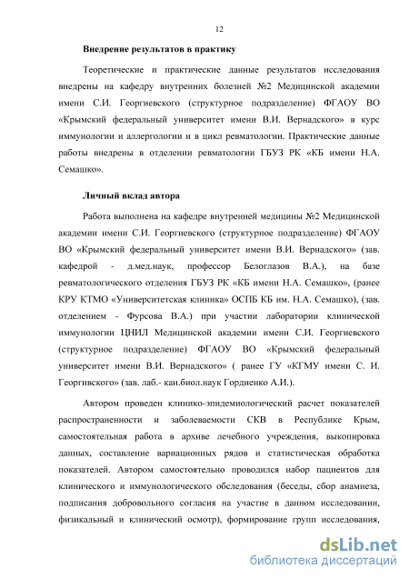 Теоретические и практические данные результатов исследования внедрены на кафедру внутренних болезней №1 и №2 Медицинской академии имени С.И. Георгиевского (структурное подразделение) ФГАОУ ВО «Крымский федеральный университет имени В.И. Вернадского» в курс иммунологии и аллергологии и в цикл ревматологии. Практические данные работы внедрены в отделении ревматологии Государственного бюджетного учреждения здравоохранения Республики Крым «Клиническая больница имени Н.А. Семашко», г. Симферополь.
