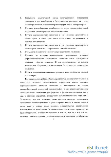 Впервые изучена биотрансформация и фармакокинетика нового противопаркинсонического препарата гимантана у крыс и кроликов на основе высокоэффективной жидкостной хроматографии с масс-спектрометрическим детектированием, определены стандартные фармакокинетические параметры. Установлено, что при различных путях введения гимантан подвергается интенсивной биотрансформации, и уже в первые минуты в плазме крови и мозге крыс, а также плазме крови кроликов регистрируются значительные концентрации его метаболитов. По данным масс-спектральных характеристик были обнаружены 3 метаболита гимантана с m/z 250, m/z 266 и m/z 282, по- видимому, соответствующих гидроксилированным продуктам метаболизма, которые определяются в плазме крови кроликов в течение 24 часов, а у крыс - в течение 6 часов. В результате проведенного исследования установлено, что для гимантана характерна высокая степень проникновения в орган-мишень мозг и относительно высокая абсолютная биодоступность.