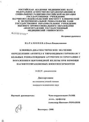 Основные положения диссертации изложены в 18 печатных работах, из которых 8 — в центральной и 10 - в местной печати. Материалы диссертации были представлены на I Международной (X Всероссийской) Пироговской студенческой научной медицинской конференции (Москва, 2006 г.), II Всероссийской конференции «Социальные аспекты ревматических заболеваний», (Воронеж, 2006), XIV Российском национальном конгрессе «Человек и Лекарство» (Москва, 2007 г.), конгрессе «Здоровье нации и Здравоохранение» (Москва, 2007), XII Всероссийской научно-практической конференции «Молодые ученые в медицине» (Казань, 2007), научно-практической конференции молодых ученых (Санкт-Петербург, 2007), XIV Международной научной конференции студентов, аспирантов и молодых ученых «Ломоносов» (Москва, 2007), V конференции с международным участием «Диагностика в клинической медицине» (Египет, Хургада, 2008), на III международной (XII Всероссийской) Пироговской студенческой научной медицинской конференции (Москва, 2008), ежегодных научных конференциях студентов и молодых ученых ВолГМУ (2002-2008 гг.), ежегодных научных конференциях ГУ РЖИ КиЭР РАМН (2002-2008 гг.). Подан патент на изобретение «Способ очистки крови от антител к тиреоидным гормонам с помощью иммобилизированного гранулированного магнитоуправляемого препарата» (№ заявки 2007141446/15(045365)).