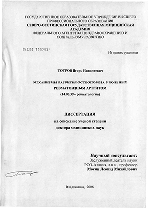 Материалы диссертационной работы получили отражение в 2 учебных пособиях, вошли в лекционный курс по разделам внутренних болезней для студентов Северо-Осетинской государственной медицинской академии, а также врачей-терапевтов и ревматологов на циклах усовершенствования по теме «Ревматология».