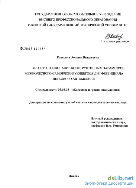 Целью диссертационной работы является анализ влияния межколёсного самоблокирующегося дифференциала на тягово-скоростные свойства, устойчивость и управляемость движения легкового автомобиля и разработка методики выбора и обоснования базовых конструктивных параметров и характеристик межколёсного самоблокирующегося дифференциала.