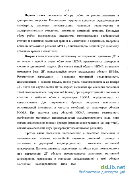 Первая глава посвящена обзору работ по рассматриваемым в диссертации вопросам. Рассматрены структура кристалла редкоземельного ортоферита, спиновые конфигурации, основные теоретические и экспериментальные результаты динамики доменной границы. Приведен обзор работ, посвященных численному моделированию особенностей статики и динамики доменных границ в магнетиках с дефектами. Подробно описаны возможные решения МУСГ, описывающего нелинейную динамику доменных границ в магнетиках.