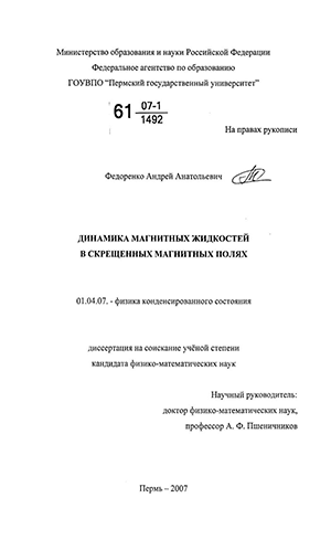 Результаты работы докладывались: на девятой международной конференции по магнитным жидкостям (г. Бремен. 2001); на конференции молодых ученых НОЦ "Неравновесные переходы в сплошных средах" (г. Пермь, 2002); на 10-й международной конференции по магнитным жидкостям (г. Плесе в 2002); на зимних школах по механике сплошных сред в г. Перми в 2003 и 2007 году. Основные результаты исследований опубликованы [1 - 10]. Работа выполнялась при поддержке РФФИ (гранты № 01-02-17839 и № 02-03-33003), Американского фонда гражданский исследований АФГИР (грант №РЕ-009-0) и НОЦ "Неравновесные переходы в сплошных средах" (грант № 02-01н-012и).
