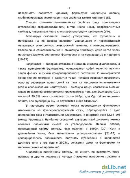 В настоящее время основная масса производимых фуллеренов извлекается из фуллеренсодержащей сажи, образующейся в дуге постоянного тока с графитовыми электродами в инертном газе [3,18-19] (метод Кречмера). Наиболее серьезной альтернативой дуговому методу является пламенный синтез из углеводородов. Первый патент, посвященный такому синтезу, был получен в 1992г. [20]. Хотя в дальнейшем метод был значительно усовершенствован [21-25] и декларировалась возможность получать фуллерены в количестве десятков тонн в год еще в 2003г., снижения цены на фуллерены на мировом рынке не произошло.