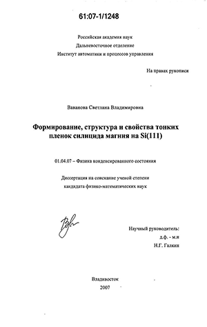 Апробация результатов работы. Основные результаты работы были представлены на 1ой, 4ой и 5ой Азиатско-Тихоокеанской конференции по фундаментальным проблемам опто- и микроэлектроники (г Владивосток, Россия, 2000 г и 2002 г , г Хабаровск, Россия, 2004 г), 40М Российско-Японском семинаре по физике поверхности полупроводников JRSSS-4 (г Нагойя, Япония, 2000 г), 2ой Региональной научной конференции «Физика фундаментальные и прикладные исследования» (г Хабаровск, Россия, 2001г), Зеи Региональной научной конференции «Физика фундаментальные и прикладные исследования» (г Благовещенск, Россия, 2002 г), 9ой Всероссийской научной конференции студентов-физиков и молодых ученых (г Красноярск, Россия, 2003 г), 7ой, 8ой, 9ой и 10ой Региональной конференции студентов, аспирантов и молодых ученых по физике полупроводниковых, диэлектрических и магнитных материалов (г Владивосток, Россия, 2003-2006 гг), конференции Азиатско-Тихоокеанского региона «Полупроводниковые силициды-2006» (г Нара, Япония, 2006 г) Публикации. По теме диссертации опубликованы 6 статей в реферируемых научных журналах и 3 статьи в сборниках трудов региональных и международных конференций