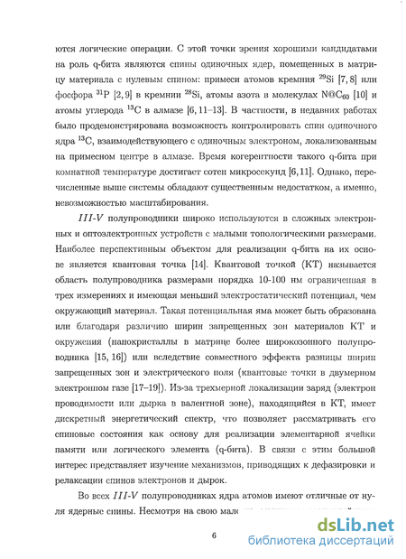 III-V полупроводники широко используются в сложных электронных и оптоэлектронных устройств с малыми топологическими размерами. Наиболее перспективным объектом для реализации q-бита на их основе является квантовая точка [14]. Квантовой точкой (КТ) называется область полупроводника размерами порядка 10-100 нм ограниченная в трех измерениях и имеющая меньший электростатический потенциал, чем окружающий материал. Такая потенциальная яма может быть образована или благодаря различию ширин запрещенных зон материалов КТ и окружения (нанокристаллы в матрице более широкозонного полупроводника [15, 16]) или вследствие совместного эффекта разницы ширин запрещенных зон и электрического поля (квантовые точки в двумерном электронном газе [17-19]). Из-за трехмерной локализации заряд (электрон проводимости или дырка в валентной зоне), находящийся в КТ, имеет дискретный энергетический спектр, что позволяет рассматривать его спиновые состояния как основу для реализации элементарной ячейки памяти или логического элемента (q-бита). В связи с этим большой интерес представляет изучение механизмов, приводящих к дефазировки и релаксации спинов электронов и дырок.