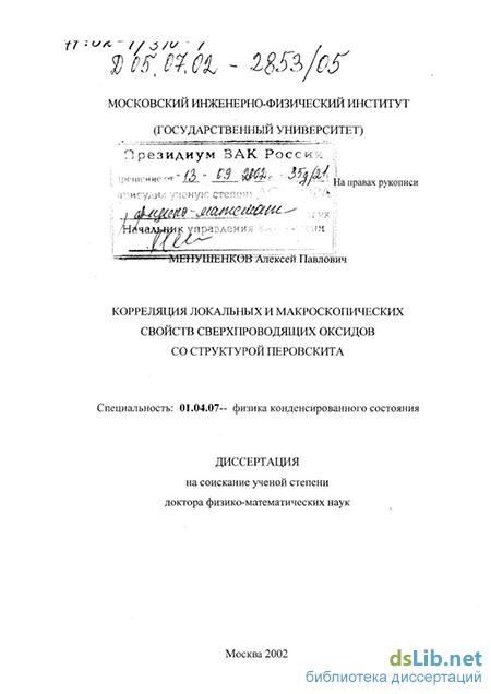 Менушенков Алексей Павлович. Корреляция локальных и макроскопических свойств сверхпроводящих оксидов со структурой перовскита : диссертация ... доктора физико-математических наук : 01.04.07.- Москва, 2002.- 237 с.: ил. РГБ ОД, 71 02-1/310-1