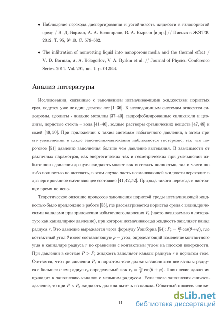 Теоретическое описание процессов заполнения пористой среды несмачивающей жидкостью было предложено в работе [53], где рассматривается пористая среда с цилиндрическими каналами при приложении избыточного давления Рс (часто называемого в литературе как капиллярное давление), при котором несмачивающая жидкость заполняет канал радиуса г. Это давление выражается через формулу Уошборна [54]: Рс = cos(# + w), где контактный угол в имеет составляющую р — угол, определяющий изменение контактного угла в капилляре радиуса г по сравнению с контактным углом на плоской поверхности. При давлении в системе Р Рс жидкость заполняет каналы радиуса г в пористом теле. Считается, что при давлении Р, в пористом теле должны заполнится все каналы радиуса г большего чем радиус гс определяемый как гс = Ц cos(# + ф). Повышение давления приводит к заполнению каналов с меньшим радиусом. Если после заполнения снижать давление, то при Р Рс жидкость должна вытечь из канала. Обратный процесс, сниже ние давления, вызывает последовательный выход жидкости из каналов, размер которых меньше чем тс.
