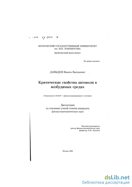 Давыдов Никита Васильевич. Критические свойства автоволн в возбудимых средах : диссертация ... кандидата физико-математических наук : 01.04.07.- Москва, 2002.- 96 с.: ил. РГБ ОД, 61 02-1/886-4