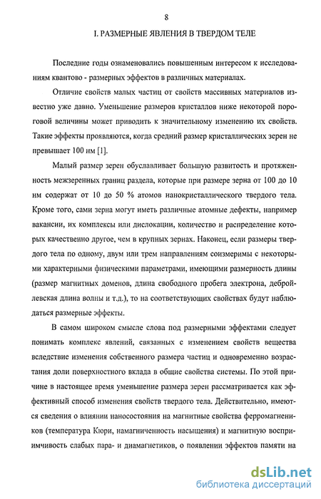 В самом широком смысле слова под размерными эффектами следует понимать комплекс явлений, связанных с изменением свойств вещества вследствие изменения собственного размера частиц и одновременно возрастания доли поверхностного вклада в общие свойства системы. По этой причине в настоящее время уменьшение размера зерен рассматривается как эффективный способ изменения свойств твердого тела. Действительно, имеются сведения о влиянии наносостояния на магнитные свойства ферромагнени-ков (температура Кюри, намагниченность насыщения) и магнитную восприимчивость слабых пара- и диамагнетиков, о появлении эффектов памяти на