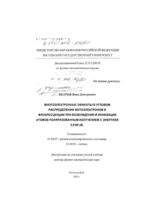 Петров Иван Дмитриевич. Многоэлектронные эффекты в угловом распределении фотоэлектронов и флуоресценции при возбуждении и ионизации атомов поляризованным излучением с энергией 2.5-90 эВ : диссертация ... доктора физико-математических наук : 01.04.07, 01.04.05.- Ростов-на-Дону, 2002.- 358 с.: ил. РГБ ОД, 71 02-1/340-3