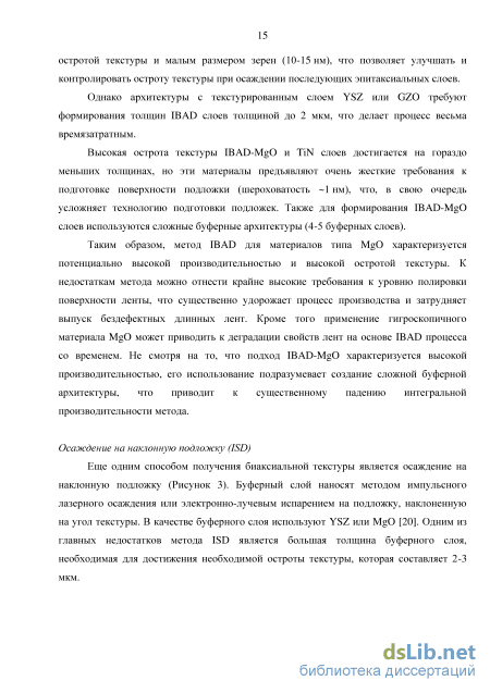 Таким образом, метод IBAD для материалов типа MgO характеризуется потенциально высокой производительностью и высокой остротой текстуры. К недостаткам метода можно отнести крайне высокие требования к уровню полировки поверхности ленты, что существенно удорожает процесс производства и затрудняет выпуск бездефектных длинных лент. Кроме того применение гигроскопичного материала MgO может приводить к деградации свойств лент на основе IBAD процесса со временем. Не смотря на то, что подход IBAD-MgO характеризуется высокой производительностью, его использование подразумевает создание сложной буферной архитектуры, что приводит к существенному падению интегральной производительности метода. Осаждение на наклонную подложку (ISD)