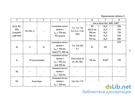 Синтетические кристаллы относят к типу lb (примесь - парамагнитный азот) и ПЬ (примесь - бор). Алмазы типа ПЬ имеют голубой цвет и являются полупроводниками р-штюм. Они обладают большой дырочной проводимостью а 10"4 Ом см"1, обусловленной акцепторами бора (ширина за-прещенной зоны (Eg) «3,7 эВ) с концентрацией около 5-10 см" [6]. Повышенная проводимость может быть обусловлена дислокационными уровнями с энергией термической активации Еа » 0,3 -=-0,6 эВ, либо какими-либо другими дефектами структуры, в том числе и метастабильными, а также явлениями на поверхности. В спектрах фотопроводимости проявляются Л-дефекты - глубокие доноры с Ed 4,1 эВ [6]. Известны синтетические кристаллы как/?- (легированные бором, рас-творимость в алмазе до 10 см"), так и п- типа (легированые мышьяком). Последний тип проводимости наблюдается также при ионной имплантации лития. Кристаллы алмаза содержат примеси и дефекты, которые создают в запрещенной зоне локальные уровни. Различными методами исследования в алмазе обнаружено большое число примесей в количествах до нескольких атомов на 10 атомов решетки [7]. Однако на электрические и оптические свойства оказывают заметное влияние только азот и бор. Оба эти элемента входят в решетку алмаза как примеси замещения. С целью уточнения поведения бора в качестве легирующей примеси исследовалась имплантация бора в алмаз [8]. Для опытов использовались образцы алмаза, полученные высокотемпературным синтезом при высоком давлении. Установлено, что при температуре имплантации от 300 до 800 К спектр ядерного магнитного резонанса показывает наличие Ларморовского резонанса. Асимметрия поляризации при Ларморовском резонансе дает долю ионов бора в местах с полностью тетраэдрической симметрией в 12 % при 300 К и в 17 % при 800 К. Предполагается, что замещение атомами бора происходит при прямой замене во время имплантации. Бор также находится в местах с низкой симметрией. В табл. 2 приведены модели основных дефектов по физической классификации алмазов, суммированные на основании [6], которые определяют тип алмаза, оптические свойства в УФ-, ИК- и видимой областях (ВО),