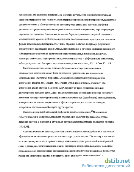 Дальние H/D изотопные эффекты на химических сдвигах ядра 1ЭС карбоксильной группы могут служить для оценки среднего положения протона в водородном мостике. Однако в случае двуямного потенциала, характерного для комплексов с очень сильной водородной связью, знания среднего значения колебательной координаты протона еще не достаточно для определения полной геометрии водородного мостика и его спектральных характеристик. Необходима дополнительная информация об относительной заселенности уровней в двойной потенциальной яме, которая может быть получена, например, из спектров ЯМР на ядрах 15N.