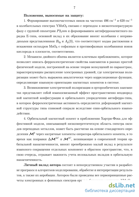 Личный вклад автора состоит в непосредственном участии в разработке программ и алгоритмов моделирования, обработке и интерпретации результатов, а также их апробации. Автором были проведены все первопринципные расчеты электронных и фононных спектров орторомбического манганита YMnOз, выполнены расчеты электрической поляризации в модели двойного обмена и приближении Хартри-Фока для всех рассматриваемых систем и получены аналитические выражения ферроэлектрической поляризации в теории возмущений для моноклинного BiMnO3 и гексагонального YMnO3. Наконец, автором разработан, реализован и апробирован метод расчета орбитальных магнитных моментов на основе современной теории орбитальной намагниченности в приближении Хартри-Фока. Параметры эффективных гамильтонианов в модели Хаббарда, а также аналитическое выражение для электрической поляризации орторомбического YMnO3 в теории возмущений были получены И.В. Соловьевым. Постановка задач, выбор методов их решения и обсуждение полученных результатов были проведены совместно с научным руководителем и научным консультантом.