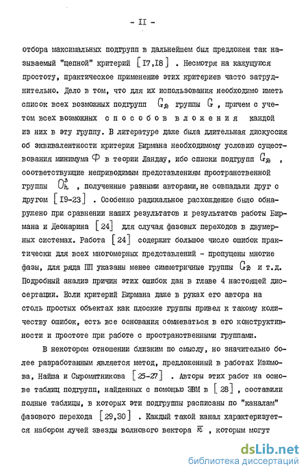 отбора максимальных подгрупп в дальнейшем был предложен так называемый "цепной" критерий [ 17,18 ] . Несмотря на кажущуюся простоту, практическое применение этих критериев часто затруднительно. Дело в том, что для их использования необходимо иметь список всех возможных подгрупп G# группы G , причем с учетом всех возможных способов вложения каждой из них в эту группу. В литературе даже была длительная дискуссия об эквивалентности критерия Бирмана необходимому условию существования минимума Ф в теории Ландау, ибо списки подгрупп G» , соответствующие неприводимым представлениям пространственной группы Uh. , полученные разными авторами, не совпадали друг с другом [ 19-23J . Особенно радикальное расхождение было обнаружено при сравнении наших результатов и результатов работы Бирмана и Деонарина [ 24J для случая фазовых переходов в двумерных системах. Работа [24] содержит большое число ошибок практически для всех многомерных представлений - пропущены многие фазы, для ряда ІШ указаны менее симметричные группы G» и т.д. Подробный анализ причин этих ошибок дан в главе 4 настоящей диссертации. Если критерий Бирмана даже в руках его автора на столь простых объектах как плоские группы привел к такому количеству ошибок, есть все основания сомневаться в его конструктивности и простоте при работе с пространственными группами.