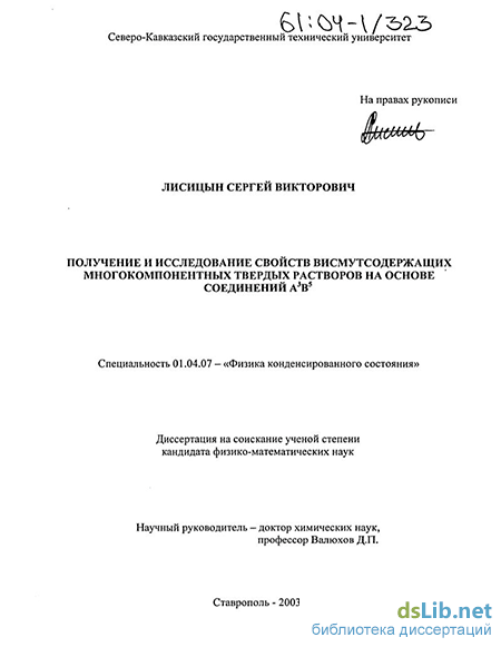 Лисицын Сергей Викторович. Получение и исследование свойств висмутсодержащих многокомпонентных твердых растворов на основе соединений А^3 В^5 : Дис. ... канд. физ.-мат. наук : 01.04.07 : Ставрополь, 2003 171 c. РГБ ОД, 61:04-1/323