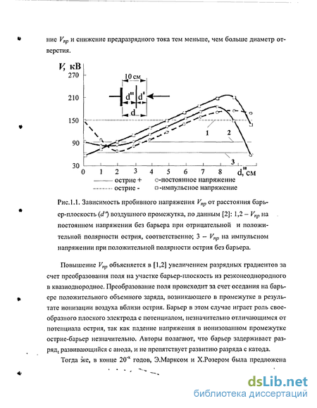 Первые работы по исследованию возможности повышения разрядного напряжения воздушных промежутков острие-плоскость за счет применения тонких диэлектрических барьеров были опубликованы Э.Марксом и Х.Розером в конце 20"х годов [1,2].