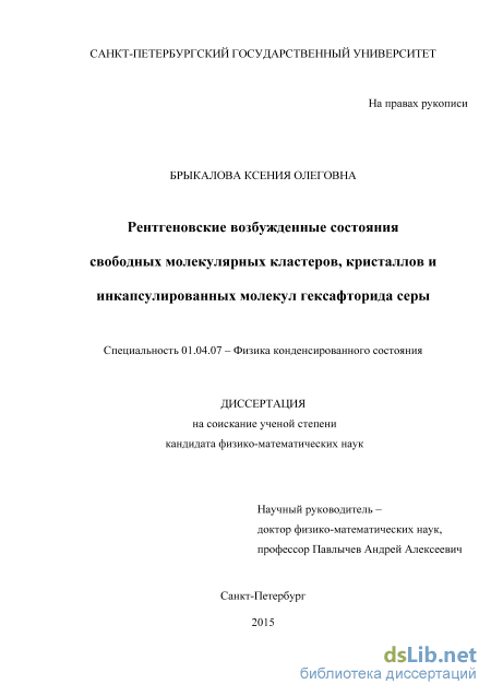 Личный вклад автора в диссертационную работу. Лично автором проведены теоретические расчеты образования S 2р вакансии в свободных молекулярных кластерах SF6, кристалле SF6, а также S 2р и 1s вакансии в молекуле SF6, инкапсулированной внутрь фуллеренов, разработаны методы описания и анализа резонансов формы и выполнен теоретический анализ экспериментальных спектров поглощения вблизи S 2р края в свободных молекулах SF6, молекулярных кластерах SF6, а также спектров полного электронного выхода из твердого SF6. Все изложенные в работе подходы, методы, теоретические модели, а также полученные результаты обсуждались совместно с профессором, доктором физико-математических наук, Павлычевым Андреем Алексеевичем.