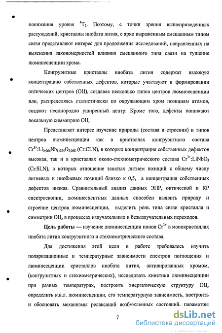 Представляет интерес изучение природы (состава и строения) и типов центров люминесценции как в кристаллах конгруэнтного состава Cr :Lio,966Nbi,03403,o68 (CnCLN), в которых концентрация собственных дефектов высокая, так и в кристаллах около-стехиометрического состава Сг3+:ЫЫЬОз (CnSLN), в которых отношение занятых литием позиций к общему числу литиевых и ниобиевых позиций близко к 0,5, а концентрация собственных дефектов низкая. Сравнительный анализ данных ЭПР, оптической и КР спектроскопии, люминесцентных данных способен выявить природу и строение центров люминесценции, выделить роль типа связи кристалла и симметрии ОЦ, в процессах излучательных и безызлучательных переходов.