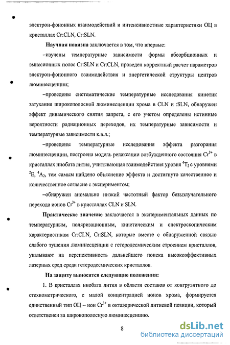 Для достижения этой цели в работе требовалось изучить поляризационные и температурные зависимости спектров поглощения и люминесценции кристаллов ниобата лития, активированных хромом, (конгруэнтных и стехиометрических), исследовать кинетики люминесценции при разных температурах, построить энергетическую структуру ОЦ, определить к.в.л. люминесценции, его температурную зависимость, построить и обосновать механизмы релаксаций возбужденных состояний, параметры