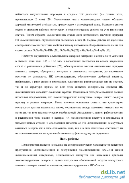 Выбор халькогенидных стекол для исследования свойств висмута обусловлен их перспективными характеристиками и технологичностью. Данный класс стекол обладает широкой полосой прозрачности от видимой области спектра и до дальней ИК области. Кроме того, такие стекла пригодны для вытяжки световодов, что является одним из самых перспективных их применений.
