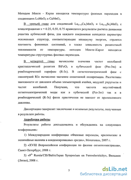 В третьей главе для соединений La(1.x)CaxMn03 и La(1.x)SrxMn03 с концентрациями х = 0.25, 0.50, 0.75 приводятся результаты расчета динамики решетки кубической фазы, для каждого соединения находятся параметры искаженных структур, соответствующие минимуму энергии, строится плотность фононных состояний, а также зависимость решеточной теплоемкости от температуры, методом Монте-Карло находятся температуры структурных фазовых переходов.