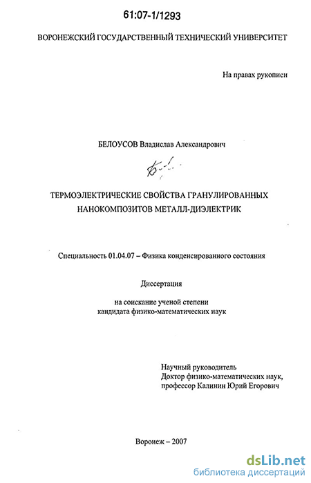 Однако, несмотря на огромный интерес, проявляемый к этим материалам, многие вопросы относительно механизмов электронного переноса в этих сложных наноструктурах остаются невыясненными, а многие экспериментальные данные противоречивы Так, до настоящего времени не существует общепринятой точки зрения на природу магнитотермоэдс, а для описания температурной зависимости сопротивления привлекаются различные механизмы слабая локализация, кулоновская блокада, прыжковый перенос, неупругое резонансное туннелирование, квантовая перколяция В связи с этим не вызывает сомнений актуальность исследований, направленных на установление более глубокого понимания физических механизмов переноса носителей заряда в нанокомпозитах металл-диэлектрик, реализация которых несет ответственность за возникновение термоэлектрических свойств