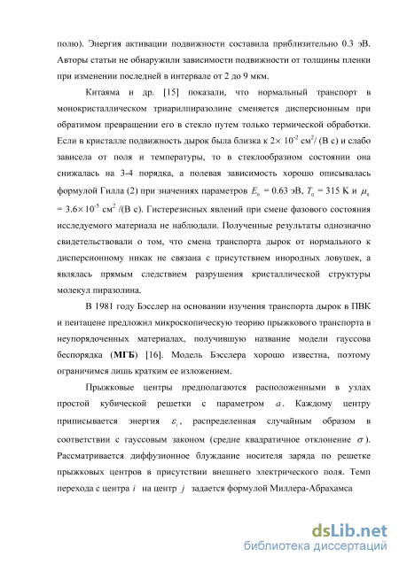 Однако за последние годы взгляд на транспорт носителей заряда в неупорядоченных органических средах существенно изменился. Было установлено, что он имеет прыжковую природу и осуществляется путем термо-активированных прыжков по системе молекулярных групп, присутствующих в макромолекулах или вводимых в полимер в качестве допанта [56]. Показано, что с хорошим приближением теория многократного захвата по-прежнему может быть использована квазизонная модель транспорта, но с одним важным дополнением. Оказывается, что теперь частотный фактор модели начинает зависеть от электрического поля по закону Пула-Френкеля (см. раздел 3)