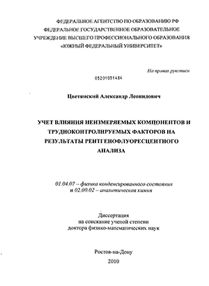 Актуальность проблемы. Физика конденсированного состояния нуждается в развитии экспериментальных методов исследования вещества. Свойства массивных и тонкопленочных объектов - электрические, магнитные, оптические и многие другие зависят от их состава и толщин. Поэтому аналитический контроль технологии получения материалов с уникальными физическими свойствами является исключительно важной и актуальной задачей физики конденсированного состояния. Из физических методов анализа материалов разнообразного состава и поверхностной плотности наиболее эффективным зарекомендовал себя метод рентгеновского флуоресцентного анализа (РФА), используемый в практике научно-исследовательских и заводских лабораторий. Однако в некоторых практических ситуациях его возможности ограничены специфическими трудностями: