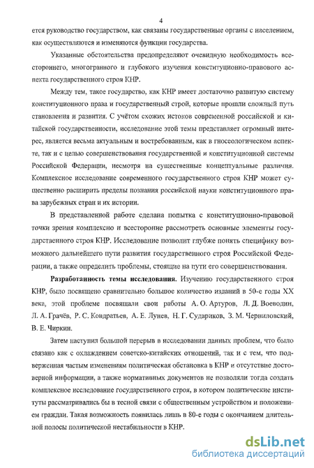 Таким образом, в нашей стране в течение почти двух десятилетий, не проводилось фундаментальных научных исследований государственного строя КНР. В тоже время за период существования КНР в нашей стране не проводилось практически ни одного фундаментального исследования конституционно-правового аспекта государственного строя и конституционного права Китая, его особенностей. В силу изложенных обстоятельств настоящее диссертационное исследование в определённой мере восполняет пробел новейшей практики исследования, и будет способствовать лучшему пониманию перспектив, направления развития и совершенствования государственного строя Российской Федерации.