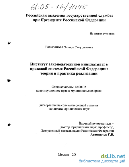 конституционно-правовой науки и российского законодательства в детальной разработке вопросов, связанных с регламентацией института законодательной инициативы. Проведенный в исследовании анализ права законодательной инициативы может представлять интерес, как для теории конституционного права, так и для практического применения в деятельности законодательных органов.