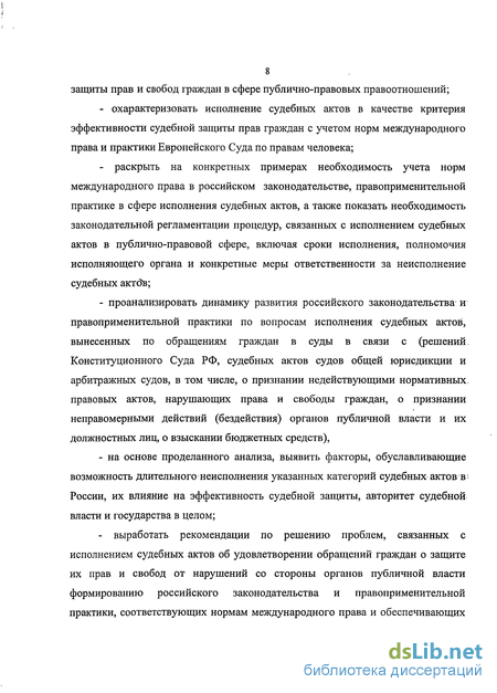 раскрыть на конкретных примерах необходимость учета норм международного права в российском законодательстве, правоприменительной практике в сфере исполнения судебных актов, а также показать необходимость законодательной регламентации процедур, связанных с исполнением судебных актов в публично-правовой сфере, включая сроки исполнения, полномочия исполняющего органа и конкретные меры ответственности за неисполнение судебных актбв;