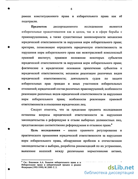 7 Работы, посвященные юридической ответственности непосредственно за нарушения норм избирательного права: Игнатенко В.В., Ищенко Е.П. Административная ответственность за нарушение российского законодательства о выборах и референдумах. М. 2000; Колюшин Е.И. Право и финансирование выборов. М. 1998; Юсов СВ. Избирательные споры в ходе федеральных и местных выборов 93-99 г. Ростов-на-Дону. 1999; Большаков СВ., Ищенко Е.П. Предвыборная агитация: взгляд изнутри. М. 1999; Игнатенко В.В., Ищенко Е.П. Юридическая ответственность за нарушения избирательного законодательства. М. 1999; Сунцов А.П. Правонарушения в сфере избирательной системы субъекта Российской Федерации. Екатеринбург. 2000; Князев С.Д. Уголовная ответственность за нарушение избирательных прав и права на участие в референдуме // Журнал российского права. 2001. № 2, и др.