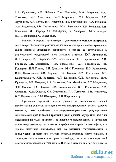 Различные стороны организации и деятельности органов внутренних дел в сфере обеспечения реализации политических прав и свобод граждан, а также вопросы укрепления законности в работе ее сотрудников в отечественной юридической науке изучались в трудах: Ю.Г. Арзамасова, Д.Н. Бахраха, В.В. Барбина, В.М. Безденежных, Л.Ш. Берекашвили, А.В. Борисова, В.Н. Бушкевича, И.И. Веремеенко, А.П. Герасимова, И.В. Гончарова, Н.Л. Гранат, Р.И. Денисова, М.И. Еропкина, Н.В. Караханова, И.Ш. Килясханова, Е.В. Киричек, В.Р. Кисина, Л.М. Колодкина, Ф.Е. Колонтаевского, А.П. Коренева, А.П. Косицына, СИ. Котюргина, В.М. Курицына, В.В. Лазарева, А.Я. Малыгина, В.А. Михайлова, Р.С. Мулукаева, Л.Л. Попова, Л.М. Розина, И.В. Ростовщикова, В.П. Сальникова, А.В. Серегина, Ю.П. Соловья, С.А Старостина, Г.А. Туманова, В.В. Черникова, B.C. Чернявского, В.М. Шамарова, А.П. Шергина и др.