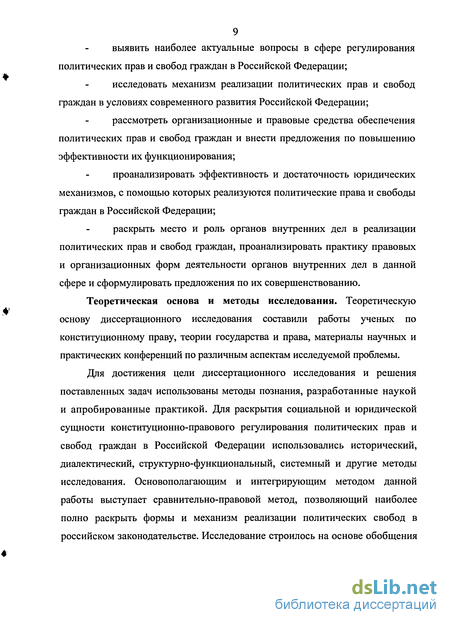 Для достижения цели диссертационного исследования и решения поставленных задач использованы методы познания, разработанные наукой и апробированные практикой. Для раскрытия социальной и юридической сущности конституционно-правового регулирования политических прав и свобод граждан в Российской Федерации использовались исторический, диалектический, структурно-функциональный, системный и другие методы исследования. Основополагающим и интегрирующим методом данной работы выступает сравнительно-правовой метод, позволяющий наиболее полно раскрыть формы и механизм реализации политических свобод в российском законодательстве. Исследование строилось на основе обобщения