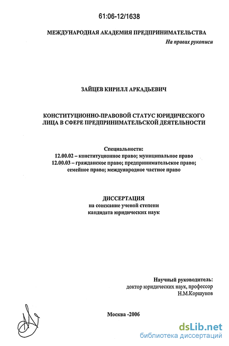 конституционно-правового статуса юридического лица в сфере предпринимательской деятельности, раскрывающих механизм реализации конституционного права человека на занятие предпринимательской