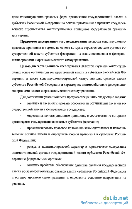 Предметом диссертационного исследования являются конституционно-правовые принципы и нормы, на основе которых строится система органов государственной власти субъектов федерации, их взаимоотношения с федеральными органами и органами местного самоуправления.