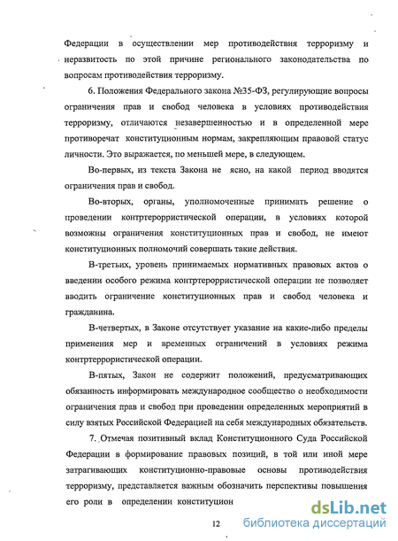 договоров в сфере борьбы с терроризмом и с принятием Федерального закона № 35-ФЗ от 6 марта 2006 г. (с последующими изменениями, в последней редакции от 30 декабря 2008 г.) «О противодействии терроризму» (далее Федеральный закон № 35-ФЗ) существует объективная необходимость в расширении исследований, посвященных проблемам, возникающим в практике регулирования и реализации правовых основ противодействия терроризму. Целый ряд положений российского законодательства, относящихся к понятийному аппарату, системе принципов и компетенции государственных органов в сфере противодействия терроризму не вполне соотносятся с нормами международного права и положениями Конституции Российской Федерации. Недостаточное внимание уделено роли судебной власти как инструменту противодействия терроризму. В контексте вопросов, рассматриваемых наукой конституционного права, весьма интересным и важным является анализ судебных решений Конституционного Суда РФ и Европейского Суда по правам человека (прежде всего в отношении России), направленных на защиту прав человека и гражданина при реализации мер по противодействию терроризму.