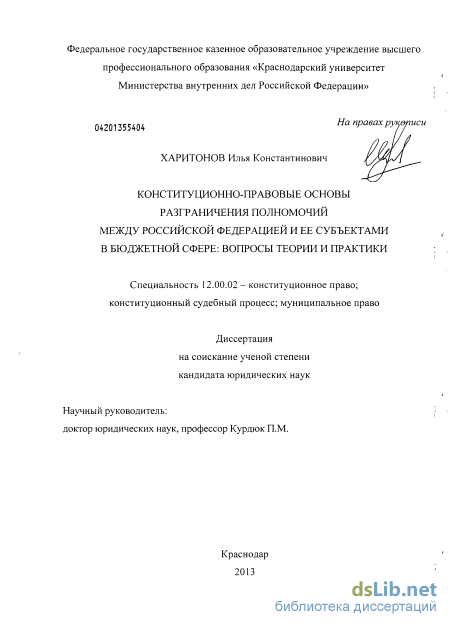 Апробация результатов исследования. Положения и выводы, содержащиеся в диссертации, были использованы в учебном процессе Краснодарского университета МВД России, Уральского государственного экономического университета, обсуждались на кафедре конституционного и муниципального права Краснодарского университета МВД России. Автор выступал с докладами по данной теме на научных конференциях (Краснодарский университет МВД России, 2011 г., 2012 г.). По теме исследования был опубликован ряд научных статей, в том числе четыре статьи в изданиях, рекомендованных Высшей аттестационной комиссией Министерства науки и образования Российской Федерации.
