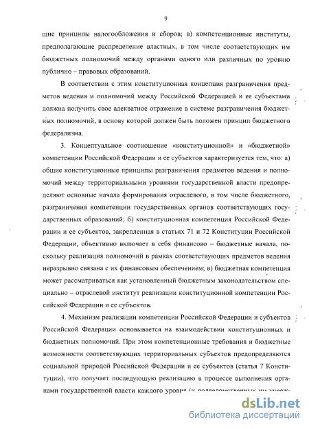 3. Концептуальное соотношение «конституционной» и «бюджетной» компетенции Российской Федерации и ее субъектов характеризуется тем, что: а) общие конституционные принципы разграничения предметов ведения и полномочий между территориальными уровнями государственной власти предопределяют основные начала формирования отраслевого, в том числе бюджетного, разграничения компетенции государственных органов соответствующих государственных образований; б) конституционная компетенция Российской Федерации и ее субъектов, закрепленная в статьях 71 и 72 Конституции Российской Федерации, объективно включает в себя финансово – бюджетные начала, поскольку реализация полномочий в рамках соответствующих предметов ведения неразрывно связана с их финансовым обеспечением; в) бюджетная компетенция может рассматриваться как установленный бюджетным законодательством специально – отраслевой институт реализации конституционной компетенции Российской Федерации и ее субъектов.