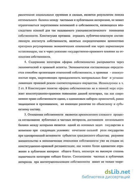 4. Содержание категории «форма собственности» раскрывается через экономический и правовой аспекты. Экономическая составляющая определя ется способом организации отношений собственности, а правовая - совокуп ностью норм, закрепляющих принадлежность материальных благ и устанав ливающих правовой режим соответствующего имущества. Используемое в ч. 2 ст. 8 Конституции понятие «форма собственности» не в полной мере отра жает конституционно-правовое понимание данной категории, так как совре менное право собственности едино, с одинаковым набором правомочий, равно защищаемое и признаваемое, но имеющее различие по объектному и субъ ектному составу.
