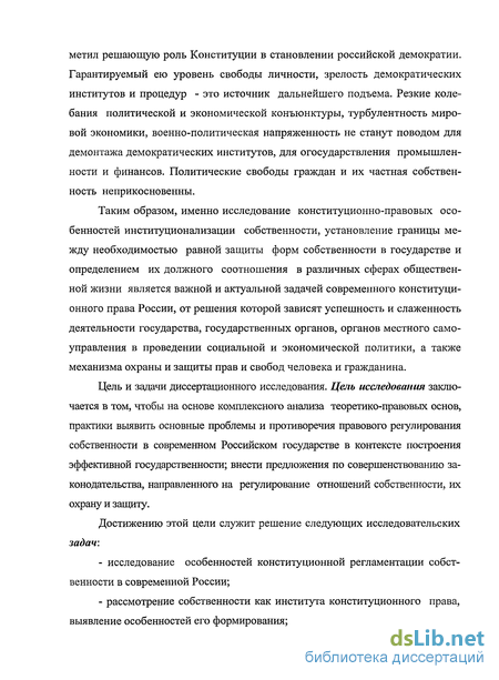Достижению этой цели служит решение следующих исследовательских задач: исследование особенностей конституционной регламентации собственности в современной России; рассмотрение собственности как института конституционного права, выявление особенностей его формирования; выявление предмета и пределов конституционного регулирования отношений собственности; исследование собственности как элемента системы конституционных ценностей; анализ теоретико-методологических основ конституционно-правовой институционализации собственности; рассмотрение конституционных основ соотношения форм собственности в Российской Федерации; выявление особенностей согласования частных и публичных интересов в отношениях собственности; анализ конституционно-правового механизма ограничения права собственности по публичным мотивам; выявление роли собственности в становлении эффективной государственности в России; рассмотрение публичной собственности как основы народовластия и государственного суверенитета; - исследование специфики национального богатства как объекта права публичной собственности; рассмотрение частной собственности как основы гражданского общества и государственности; формирование предложений и рекомендаций по совершенствованию правового регулирования отношений собственности в контексте становления эффективной государственности.