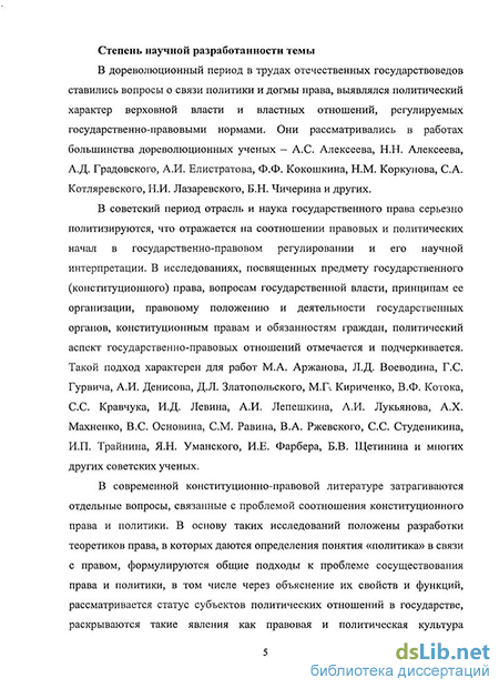 В современной конституционно-правовой литературе затрагиваются отдельные вопросы, связанные с проблемой соотношения конституционного права и политики. В основу таких исследований положены разработки теоретиков права, в которых даются определения понятия «политика» в связи с правом, формулируются общие подходы к проблеме сосуществования права и политики, в том числе через объяснение их свойств и функций, рассматривается статус субъектов политических отношений в государстве, раскрываются такие явления как правовая и политическая культура населения. В числе ученых, имеющих труды в названном направлении, значимых для данного исследования, можно назвать А.С. Автономова, С.С. Алексеева, Ю.А. Дмитриева, Д.А. Керимова, И.Ю. Козлихина, В.В. Лапаеву, М.Н. Марченко, Е.А. Лукашеву, А.С. Пиголкина, О.Ю. Рыбакова, Л.И. Спиридонова и других. Особое внимание ученых-теоретиков сосредоточено на таком явлении, как правовая политика, гармонично сочетающем политические и правовые начала, о которой пишут Ю.А. Агешин, Н.В. Витрук, Н.Н. Вопленко, В.В. Лазарев, А.В. Малько, Н.И. Матузов, B.C. Нерсесянц, Т.М. Пряхина, В.А. Рудковский и другие.