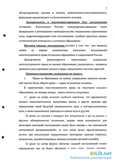 конституционного права на высшее образование, раскрывается механизм правового регулирования данного права, определяется система гарантий. Основные положения, выносимые на защиту.
