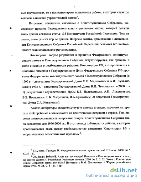 Анализ литературы свидетельствует о взлетах и спадах научного интереса к этой проблеме в зависимости от политической ситуации в стране. Так, высокая заинтересованность вопросами статуса Конституционного Собрания была характерна для 1996-2000 гг.. В этот период публикуются работы, в которых прослеживается связь между необходимостью изменения Конституции РФ и теоретическими аспектами этой проблемы2.