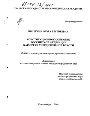 Научная новизна диссертационного исследования. В работе определены концептуальные основы правового положения Конституционного Собрания РФ как органа учредительной власти, разработаны рекомендации законодательного регулирования его статуса и процедуры пересмотра Конституции РФ.