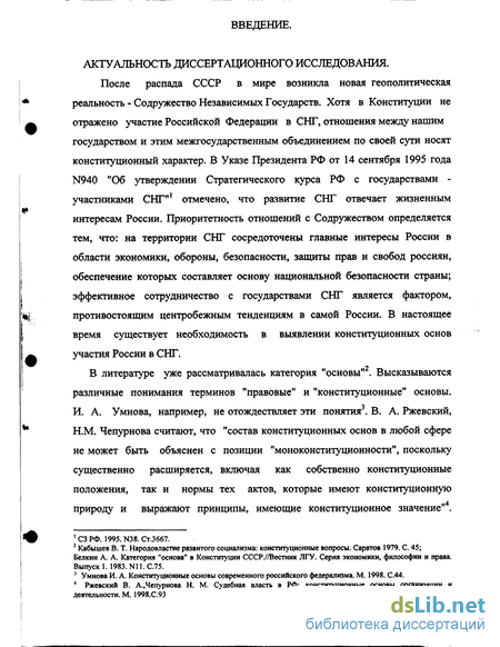 России в этом межгосударственном объединении. В нашем Основном законе не говорится о вхождении России в СНГ. Поэтому, для того, чтобы ответить на вопрос о соответствии Конституции РФ участия России в Содружестве, был проанализирован ее текст. Рассмотрению были подвергнуты федеральные нормативные акты прямо или косвенно касающиеся СНГ, некоторые нормативные договоры, подписанные Россией в рамках СНГ. К сожалению, еще не существует в России компьютерных баз данных по договорам Содружества. При рассмотрении темы диссертант использовал Конституции, уставы некоторых субъектов РФ и их договоры с центром о разграничении предметов ведения; конституции государств ближнего зарубежья, а так же США, Германии, Франции, Италии, Словакии; материалы архивов Конституционного Суда РФ, Министерства международных отношений и внешних связей Саратовской области.