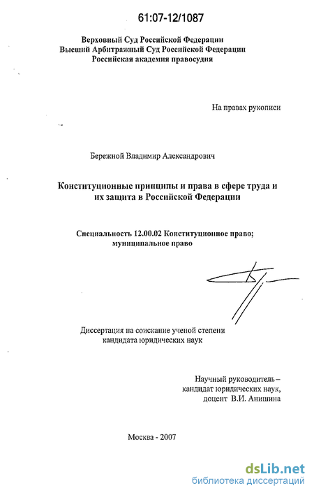 В диссертации проведен также анализ действующего законодательства ряда зарубежных стран в аспекте конституционного регулирования принципов и прав в сфере труда.