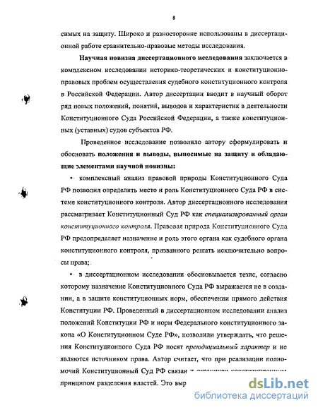 в диссертационном исследовании обосновывается тезис, согласно которому назначение Конституционного Суда РФ выражается не в создании, а в защите конституционных норм, обеспечении прямого действия Конституции РФ.. Проведенный в диссертационном исследовании анализ положений Конституции РФ и норм Федерального конституционного закона «О Конституционном Суде РФ», позволили утверждать, что решения Конституционного Суда РФ носят преюдициальный характер и не являются источником права. Автор считает, что при реализации полномочий Конституционный Суд РФ связан и ограничен конституционным принципом разделения властей. Это выражается в том, что преобразова-